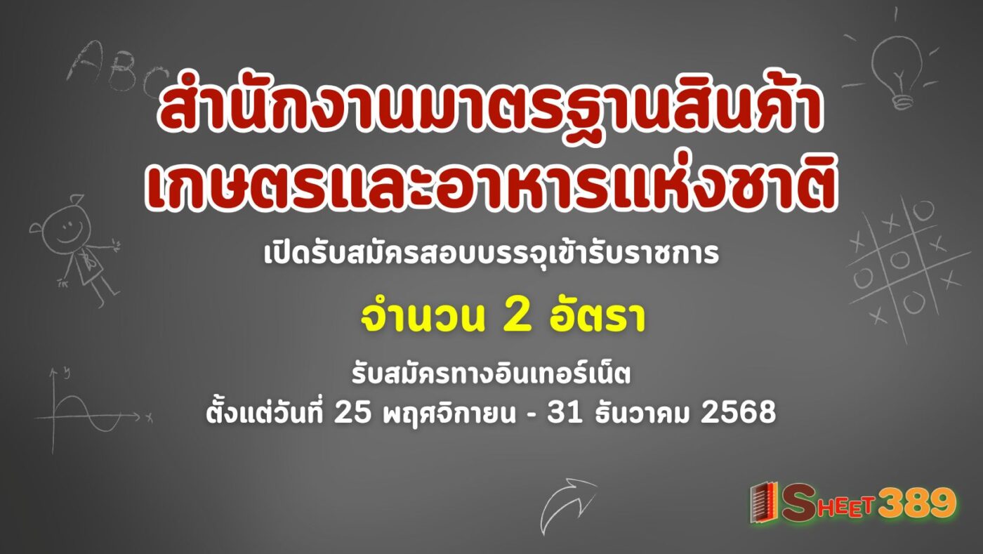 สำนักงานมาตรฐานสินค้าเกษตรและอาหารแห่งชาติ เปิดรับสมัครสอบบรรจุเข้ารับราชการ 2 อัตรา รับสมัครทางอินเทอร์เน็ต ตั้งแต่วันที่ 25 พฤศจิกายน – 31 ธันวาคม 2568