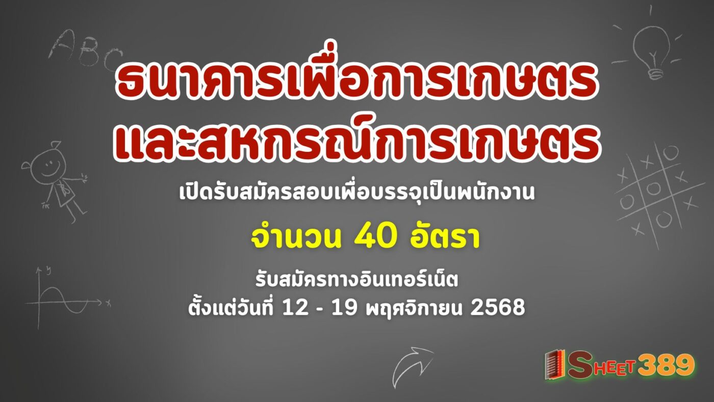 ธนาคารเพื่อการเกษตรและสหกรณ์การเกษตร เปิดรับสมัครสอบเพื่อบรรจุเป็นพนักงาน 40 อัตรา รับสมัครทางอินเทอร์เน็ต ตั้งแต่วันที่ 12 – 19 พฤศจิกายน 2568