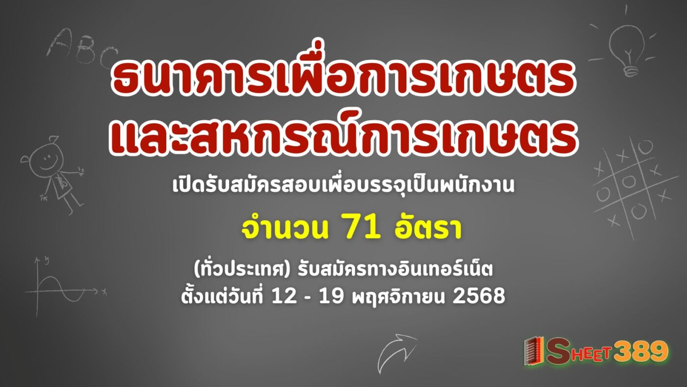 ธนาคารเพื่อการเกษตรและสหกรณ์การเกษตร เปิดรับสมัครสอบเพื่อบรรจุเป็นพนักงาน 71 อัตรา (ทั่วประเทศ) รับสมัครทางอินเทอร์เน็ต ตั้งแต่วันที่ 12 – 19 พฤศจิกายน 2568