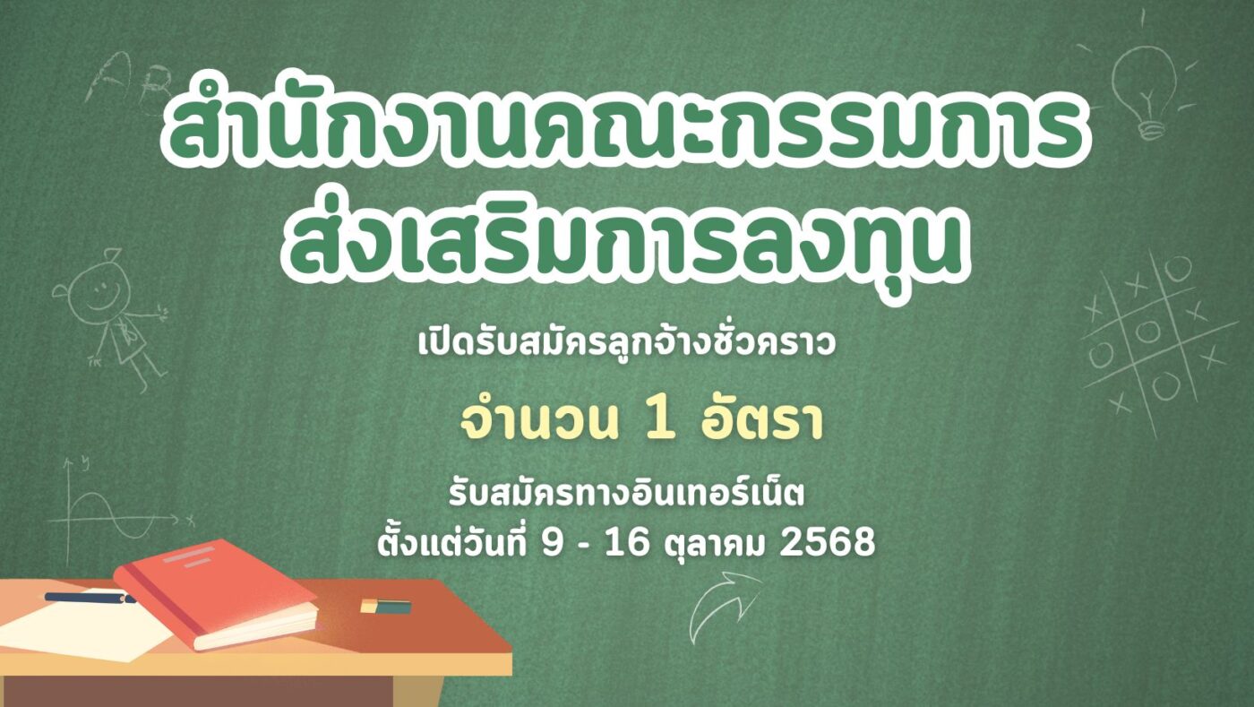 สำนักงานคณะกรรมการส่งเสริมการลงทุน เปิดรับสมัครลูกจ้างชั่วคราว 1 อัตรา รับสมัครทางอินเทอร์เน็ต ตั้งแต่วันที่ 9 – 16 ตุลาคม 2568