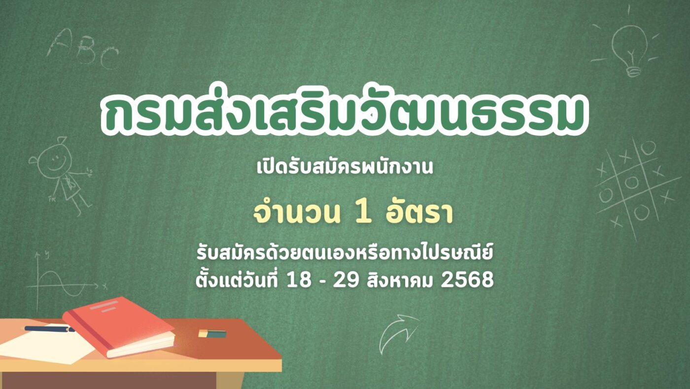 กรมส่งเสริมวัฒนธรรม เปิดรับสมัครพนักงาน 1 อัตรา รับสมัครด้วยตนเองหรือทางไปรษณีย์ ตั้งแต่วันที่ 18 – 29 สิงหาคม 2568