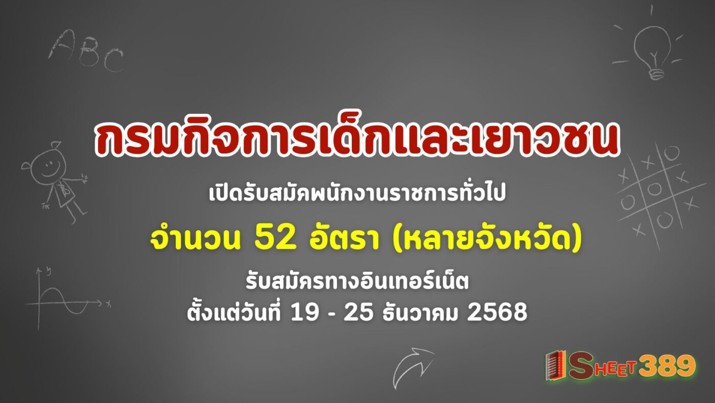 กรมกิจการเด็กและเยาวชน เปิดรับสมัคพนักงานราชการทั่วไป 52 อัตรา (หลายจังหวัด) รับสมัครทางอินเทอร์เน็ต ตั้งแต่วันที่ 19 – 25 ธันวาคม 2568