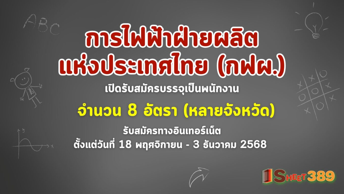 การไฟฟ้าฝ่ายผลิตแห่งประเทศไทย (กฟผ.) เปิดรับสมัครบรรจุเป็นพนักงาน 8 อัตรา (หลายจังหวัด) รับสมัครทางอินเทอร์เน็ต ตั้งแต่วันที่ 18 พฤศจิกายน – 3 ธันวาคม 2568