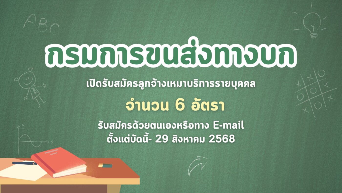 กรมการขนส่งทางบก เปิดรับสมัครลูกจ้างเหมาบริการรายบุคคล 6 อัตรา รับสมัครด้วยตนเองหรือทาง E-mail ตั้งแต่บัดนี้- 29 สิงหาคม 2568