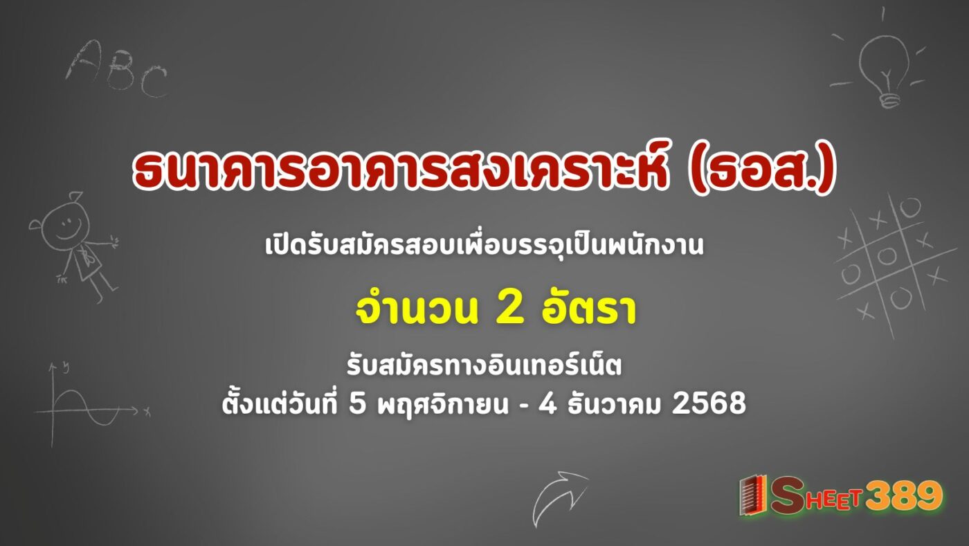 ธนาคารอาคารสงเคราะห์ (ธอส) เปิดรับสมัครสอบเพื่อบรรจุเป็นพนักงาน 2 อัตรา รับสมัครทางอินเทอร์เน็ต ตั้งแต่วันที่ 5 พฤศจิกายน – 4 ธันวาคม 2568