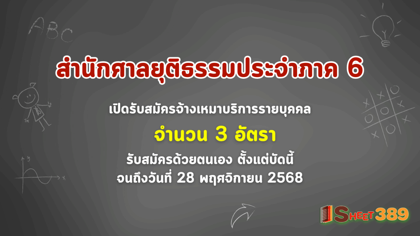 สำนักศาลยุติธรรมประจำภาค 6 เปิดรับสมัครจ้างเหมาบริการรายบุคคล 3 อัตรา รับสมัครด้วยตนเอง ตั้งแต่บัดนี้ จนถึงวันที่ 28 พฤศจิกายน 2568