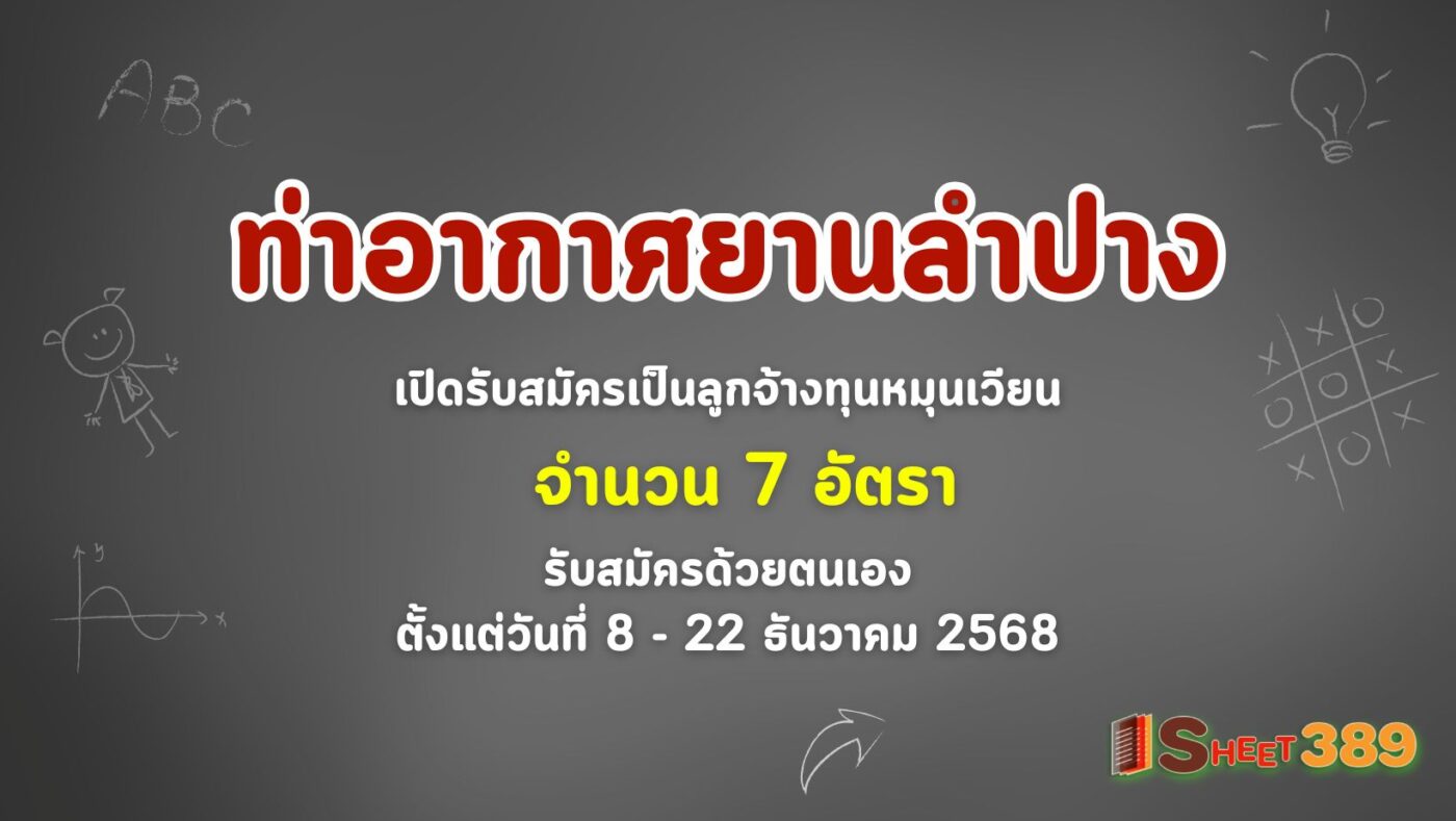 ท่าอากาศยานลำปาง เปิดรับสมัครเป็นลูกจ้างทุนหมุนเวียน 7 อัตรา รับสมัครด้วยตนเอง ตั้งแต่วันที่ 8 – 22 ธันวาคม 2568