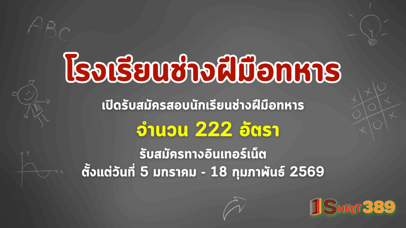 โรงเรียนช่างฝีมือทหาร เปิดรับสมัครสอบนักเรียนช่างฝีมือทหาร 222 อัตรา รับสมัครทางอินเทอร์เน็ต ตั้งแต่วันที่ 5 มกราคม – 18 กุมภาพันธ์ 2569