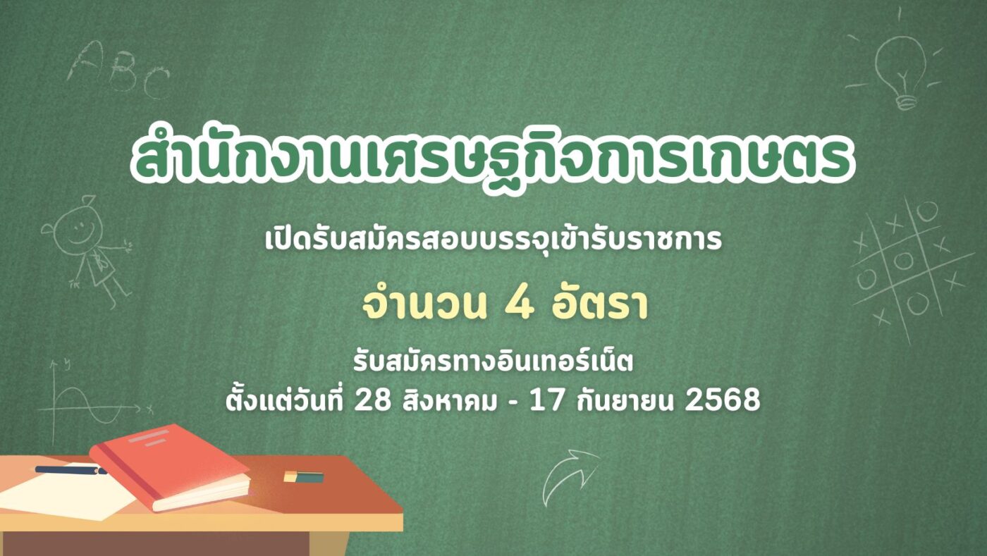 สำนักงานเศรษฐกิจการเกษตร เปิดรับสมัครสอบบรรจุเข้ารับราชการ 4 อัตรา รับสมัครทางอินเทอร์เน็ต ตั้งแต่วันที่ 28 สิงหาคม – 17 กันยายน 2568