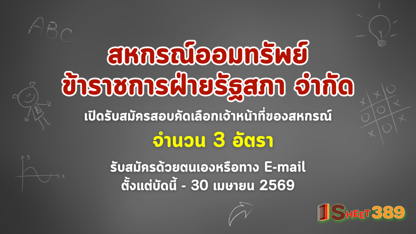 สหกรณ์ออมทรัพย์ข้าราชการฝ่ายรัฐสภา จำกัด เปิดรับสมัครสอบคัดเลือกเจ้าหน้าที่ของสหกรณ์ 3 อัตรา รับสมัครด้วยตนเองหรือทาง E-mail ตั้งแต่บัดนี้ – 30 เมษายน 2569