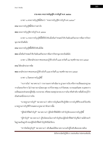 – แนวข้อสอบพระราชกฤษฎีกาว่าด้วยหลักเกณฑ์และวิธีการการบริหารกิจการบ้านเมืองที่ดีพ.ศ. 2546 และที่แก้ไขเพิ่มเติม (ฉบับที่ 2) พ.ศ. 2562