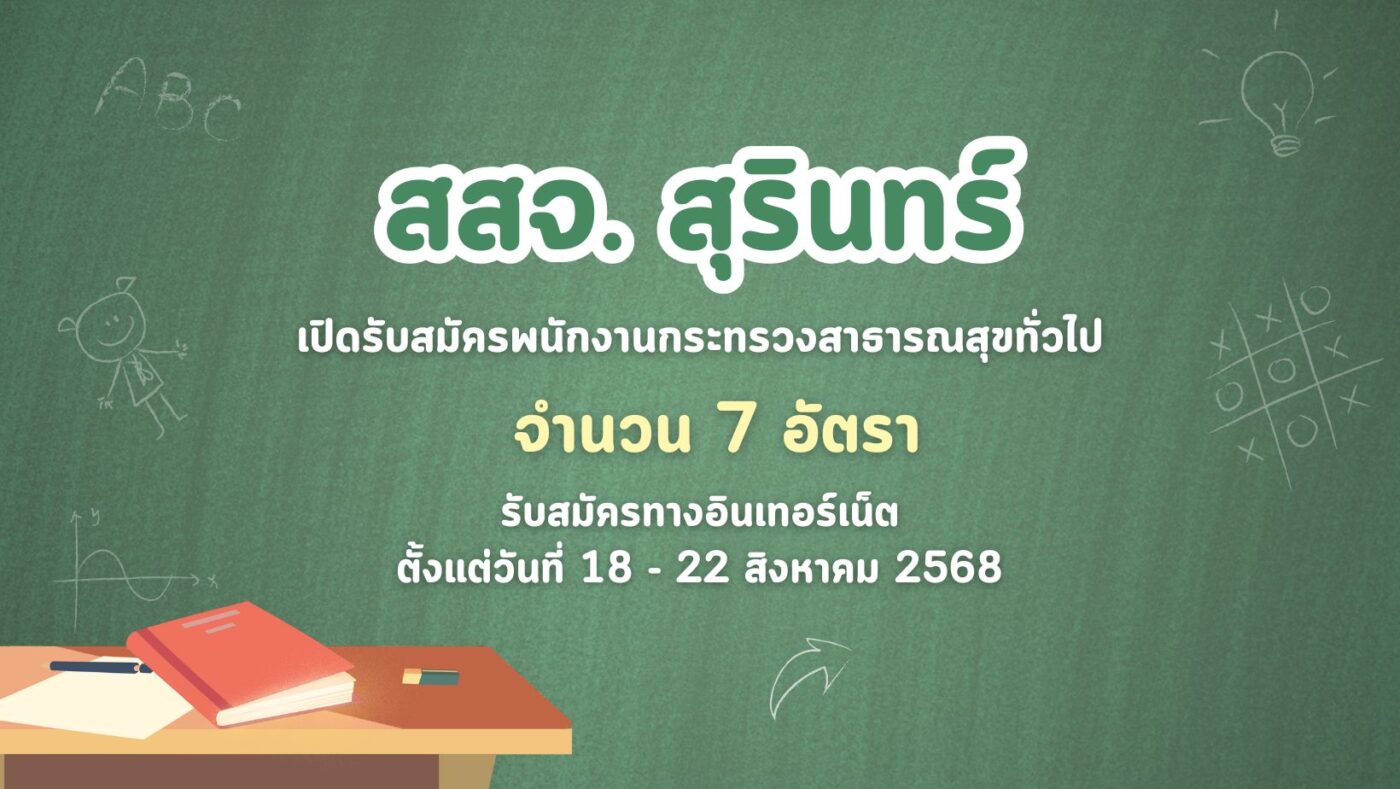 สสจ. สุรินทร์ เปิดรับสมัครพนักงานกระทรวงสาธารณสุขทั่วไป 7 อัตรา รับสมัครทางอินเทอร์เน็ต ตั้งแต่วันที่ 18 – 22 สิงหาคม 2568