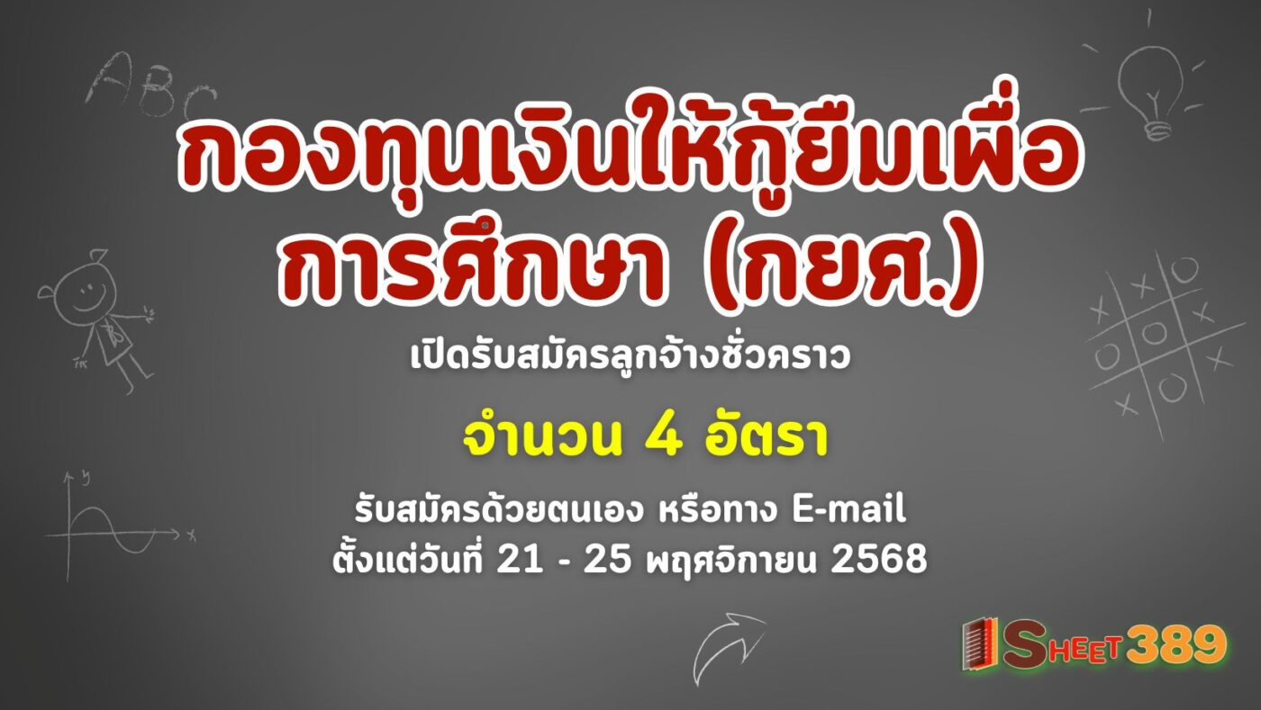 กองทุนเงินให้กู้ยืมเพื่อการศึกษา (กยศ.) เปิดรับสมัครลูกจ้างชั่วคราว 4 อัตรา รับสมัครด้วยตนเอง หรือทาง E-mail ตั้งแต่วันที่ 21 – 25 พฤศจิกายน 2568