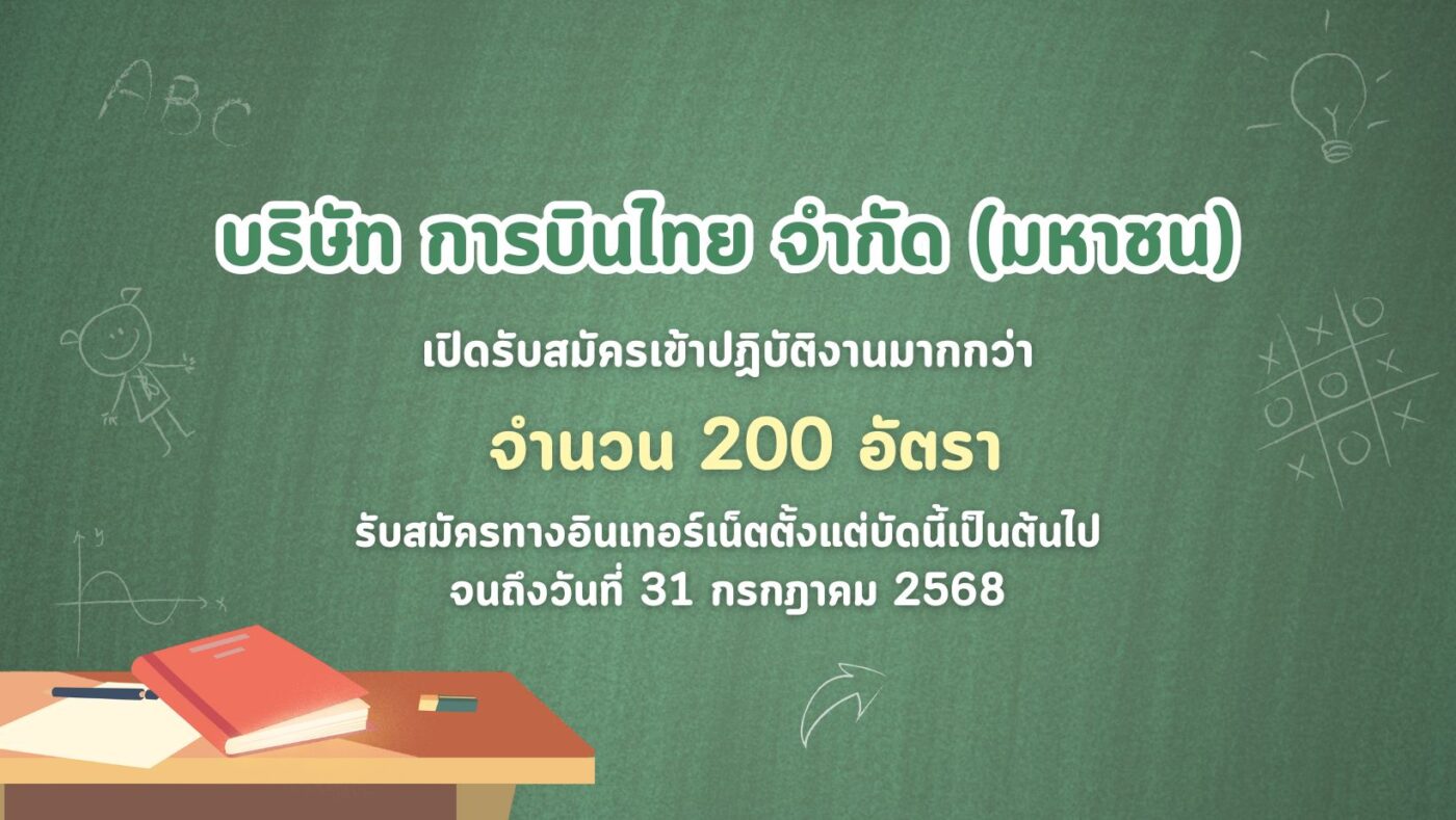 บริษัท การบินไทย จำกัด (มหาชน) เปิดรับสมัครเข้าปฏิบัติงานมากกว่า 200 อัตรา รับสมัครทางอินเทอร์เน็ต ตั้งแต่บัดนี้เป็นต้นไป จนถึงวันที่ 31 กรกฎาคม 2568