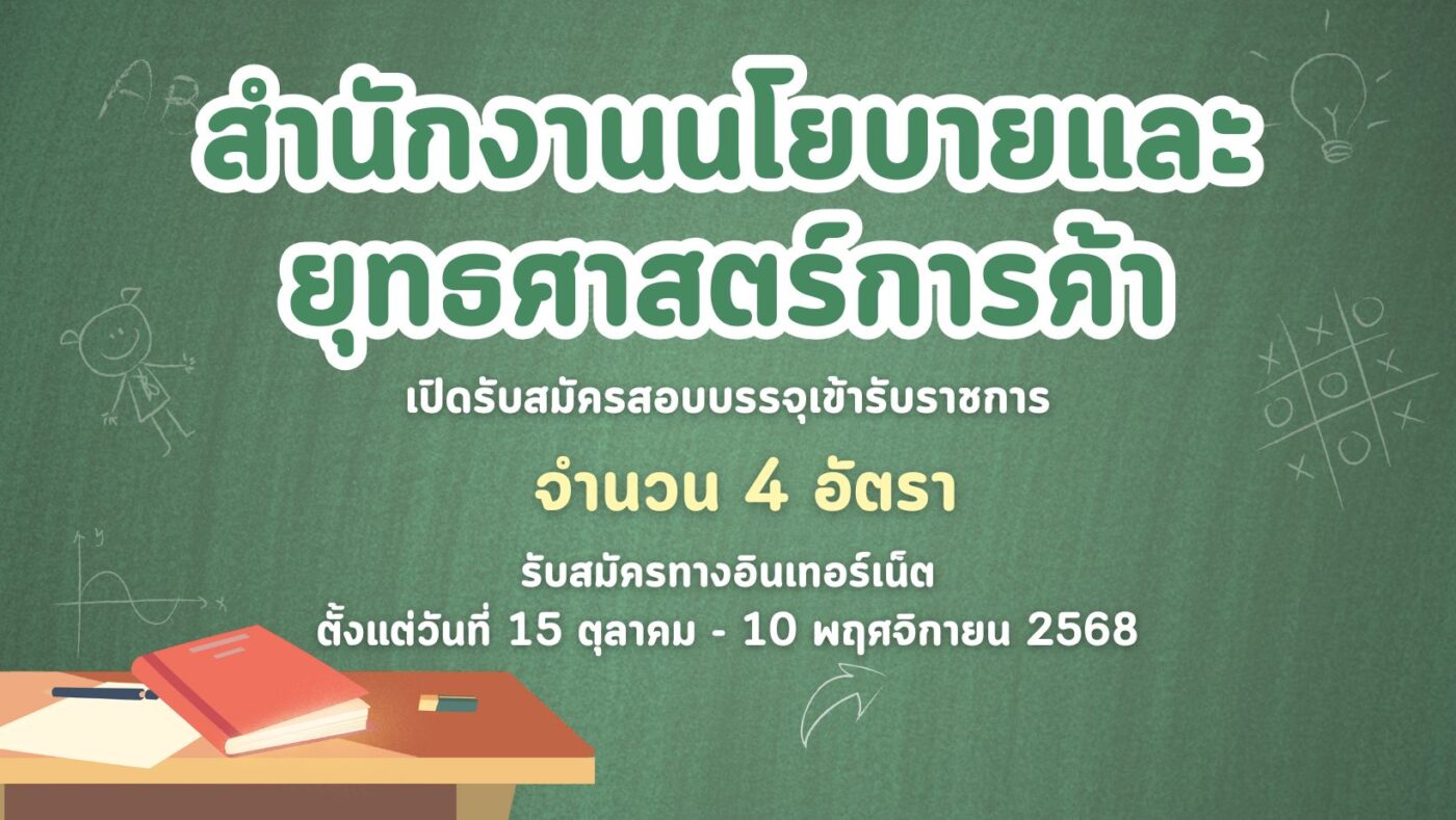 สำนักงานนโยบายและยุทธศาสตร์การค้า เปิดรับสมัครสอบบรรจุเข้ารับราชการ 4 อัตรา รับสมัครทางอินเทอร์เน็ต ตั้งแต่วันที่ 15 ตุลาคม – 10 พฤศจิกายน 2568