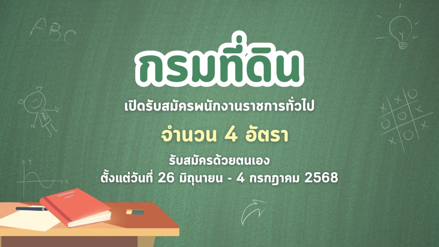 กรมที่ดิน เปิดรับสมัครพนักงานราชการทั่วไป 4 อัตรา รับสมัครด้วยตนเอง ตั้งแต่วันที่ 26 มิถุนายน – 4 กรกฎาคม 2568